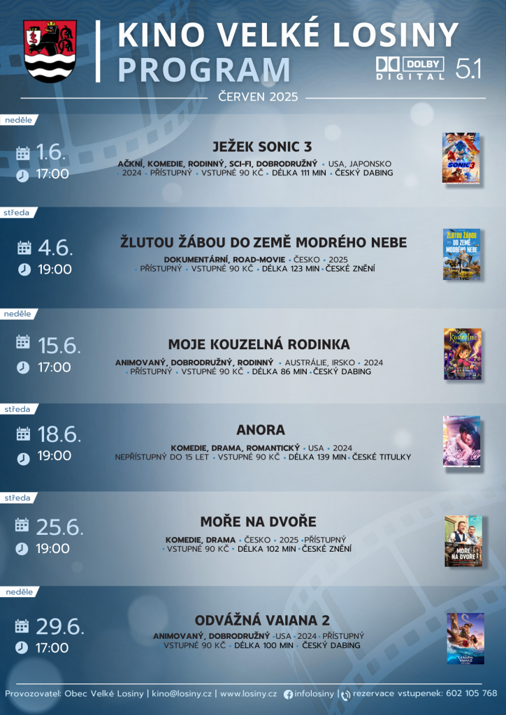 Kino Velké Losiny nabízí širokou škálu filmových zážitků pro každého. V programové nabídce najdete akční komedii "Ježek Sonic 3", dokumentární road-movie "Jdou žábou do země modrého nebe", animovaný film "Moje kouzelná rodinka", romantickou komedii "Anora" a českou komedii "Moře na dvoře". Vstupné je 90 Kč za každý film, všechny filmy mají české znění nebo titulky.