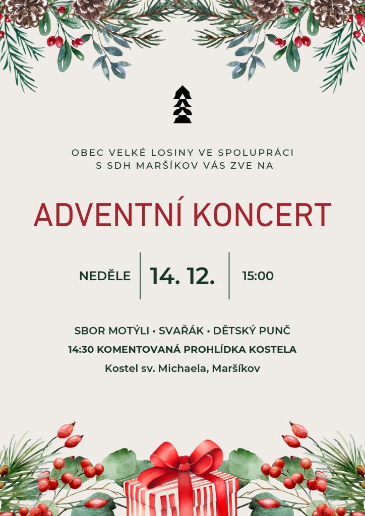 Obec Velké Losiny ve spolupráci se SDH Maršíkov vás srdečně zve na adventní koncert, který se uskuteční v neděli 14. 12. 2025. Akci obohatí vystoupení sboru Motýli, nabídneme také svařák a dětský punč. Nezapomeňte dorazit už v 14:30 na komentovanou prohlídku kostela sv. Michaela v Maršíkově.
