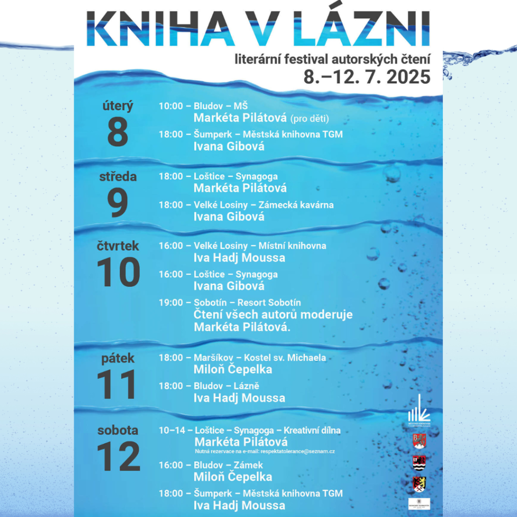 Kniha v Lázni - festival autorského čtení. Program zahrnuje čtení a kreativní dílny, moderované Markétou Pilátovou. Můžete se těšit na autory jako Miloň Čepelka a Iva Hadj Moussa. Akce se koná na různých místech včetně synagogy v Lošticích a knihovny v Šumperku.