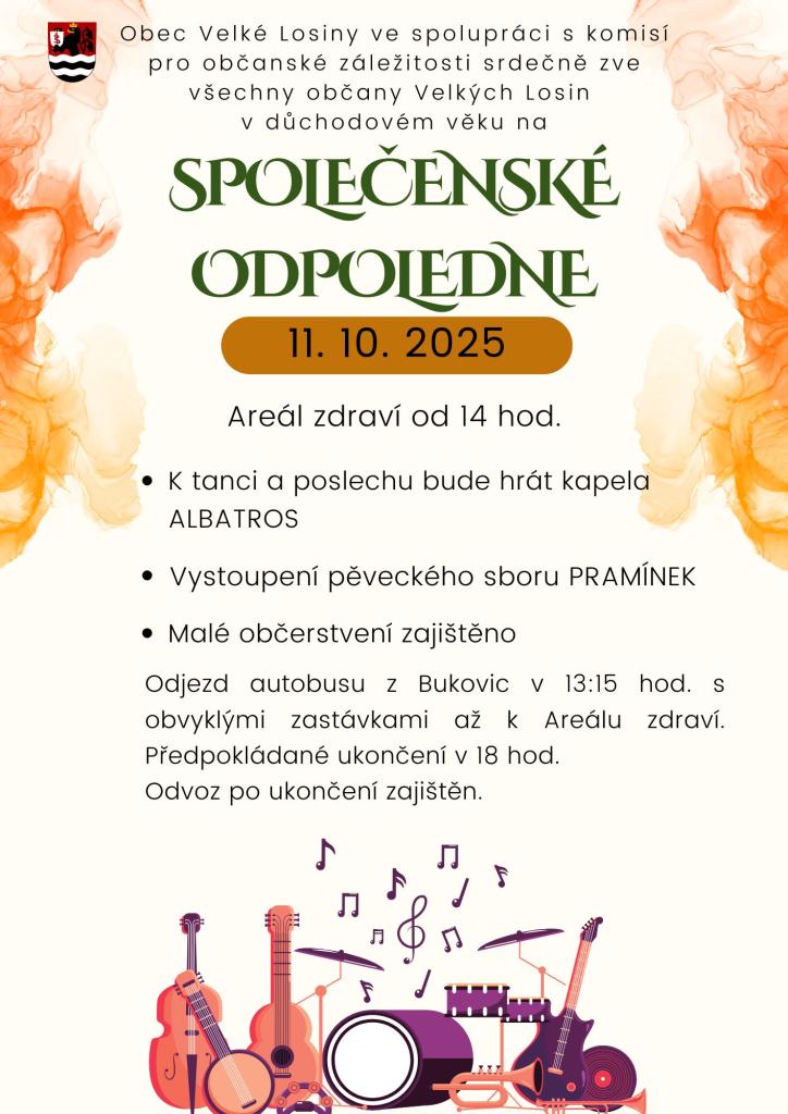 Obec Velké Losiny zve všechny občany důchodového věku na společenské odpoledne, které se koná 11. října 2025 v Areálu zdraví. Akce začne ve 14:00 a k tanci a poslechu zahraje kapela Albatros. Dále se můžete těšit na vystoupení pěveckého sboru Pramínek. Občerstvení bude zajištěno. Odjezd autobusu z Bukovic je naplánován na 13:15 s obvyklými zastávkami. Předpokládané ukončení akce je v 18:00, po kterém je zajištěn odvoz.