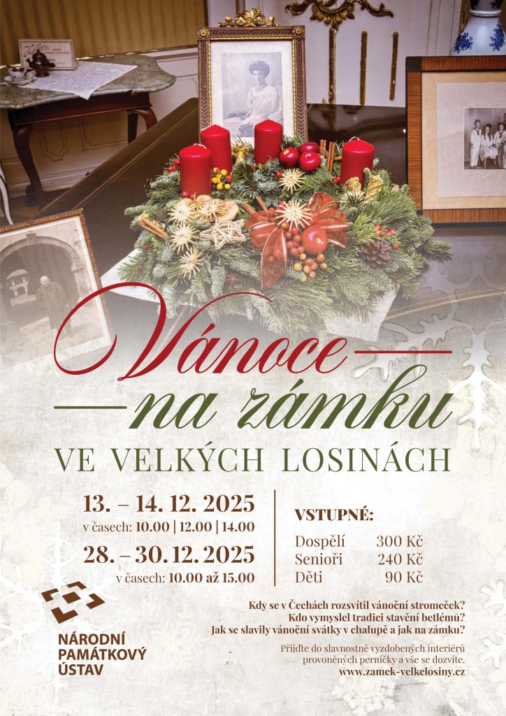 Zveme vás na Vánoce na Zámku Velké Losiny. V termínech od 13. - 14. prosince a 28. - 30. prosince 2025 si můžete vychutnat vánoční atmosféru na Zámku.