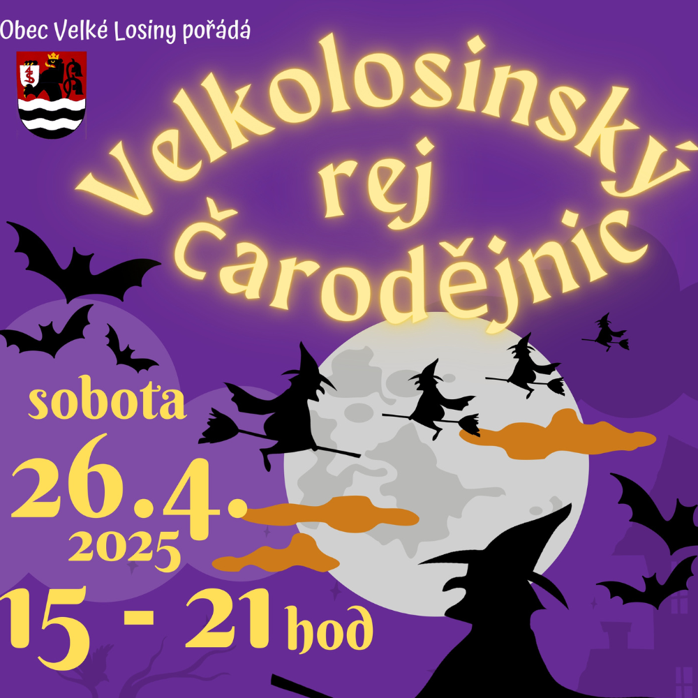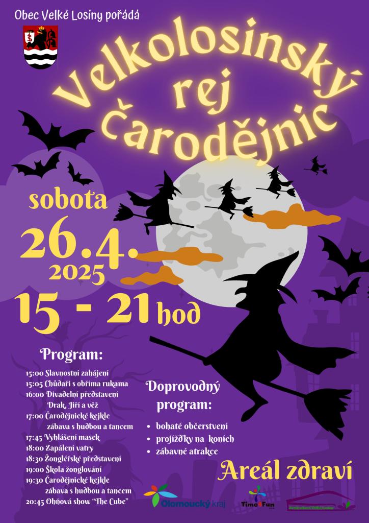 Obec Velké Losiny zve na VELKOLOSINSKÝ REJ ČARODĚJNIC, který se koná v sobotu 26. dubna 2025. Těšit se můžete na bohatý program včetně divadelního představení, čarodějnických kejklí, žonglérských vystoupení a ohňové show. Připraveno je také občerstvení a atrakce pro děti.